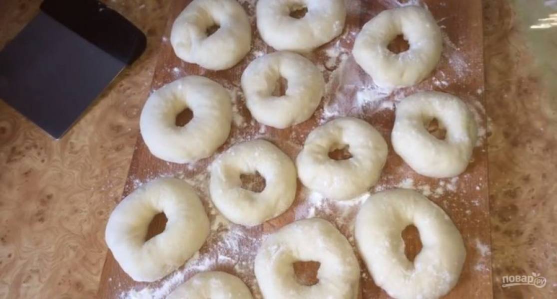 4. Рабочую поверхность слегка присыпьте мукой, выложите тесто и разделите на 12 частей, округлите их. Присыпьте шарики мукой, сформируйте круглый пончик с отверстием в середине и накройте тесто пищевой пленкой.