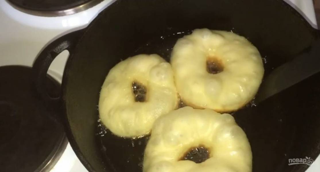 5. Оставьте на 30-40 минут. В кастрюлю налейте масло и подождите, чтобы оно хорошо прогрелось. Аккуратно по одному выложите пончики и обжарьте с каждой стороны по 1 минуте.