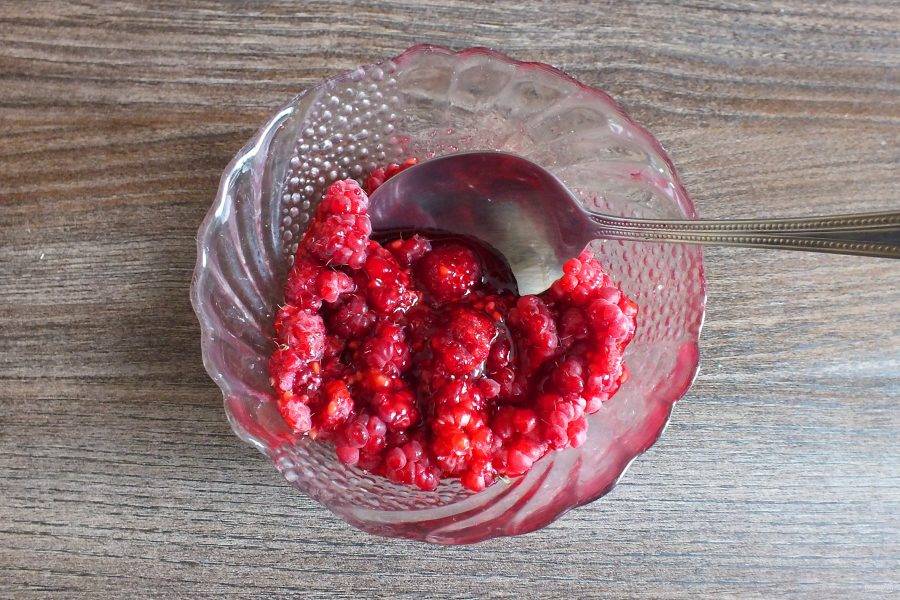 Сделайте начинку. Малину выложите в чашу, добавьте сахар и слегка помните вилкой. Очень важно, чтобы не выделилось много сока.