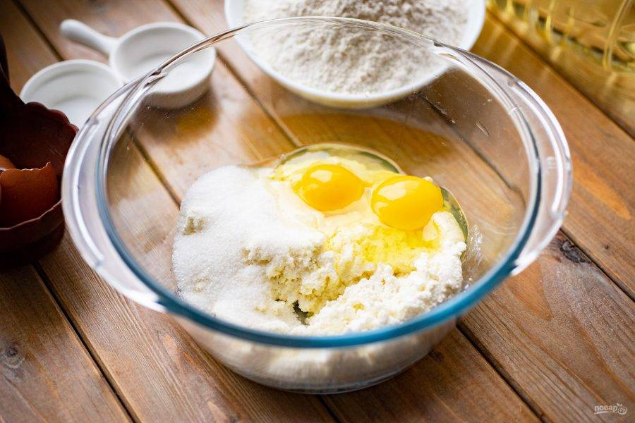 В миску выложите весь творог, добавьте яйца, сахар, соль.