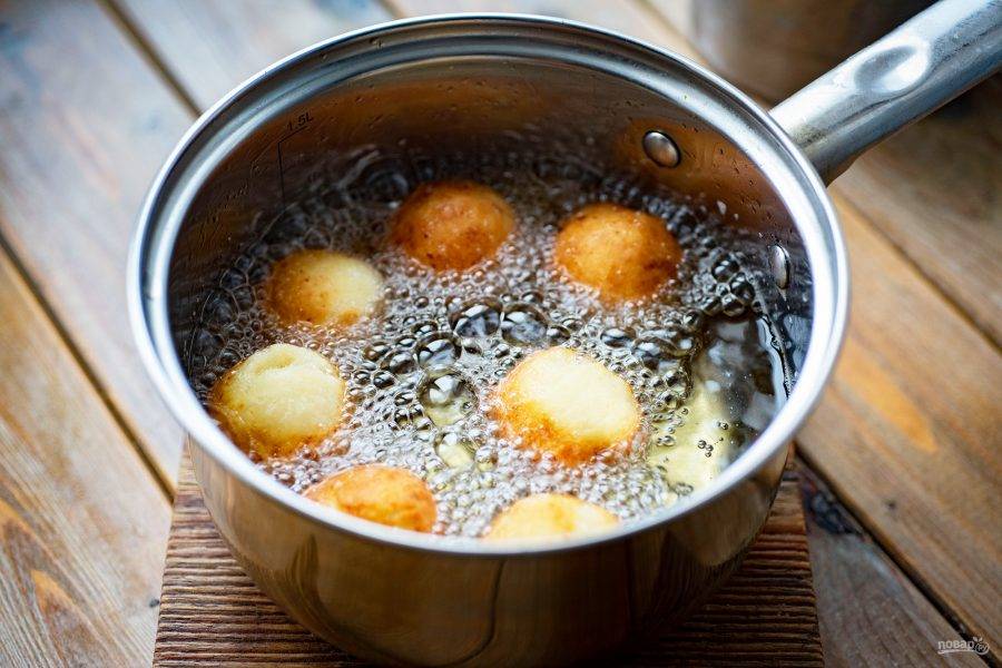 В сотейнике разогрейте на среднем огне (или даже чуть меньше, чем средний) растительное масло для фритюра и уже в хорошо разогретое масло выкладывайте шарики из творожного теста небольшими партиями. Обжаривайте шарики-пончики до аппетитного золотистого оттенка. Готовые пончики выложите на бумажное полотенце, избавляясь таким образом от излишков растительного масла.