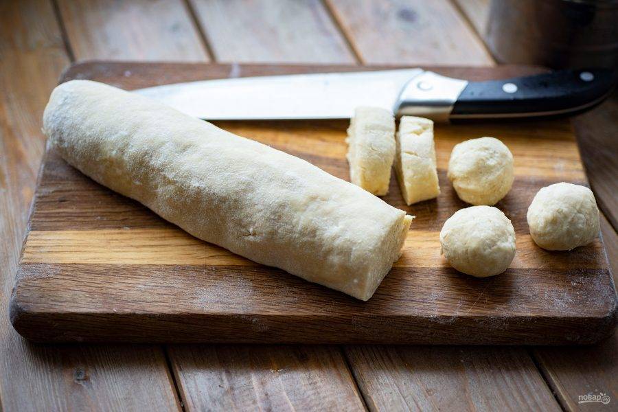Из этого теста скатайте колбаску и нарежьте на одинаковые кусочки, которые скатайте в шарики. У меня вес одного такого шарика 23-25 граммов.