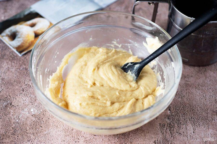 Лопаткой перемешайте все ингредиенты, замешивая однородное, вязкое тесто.