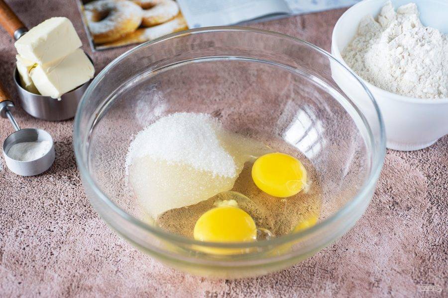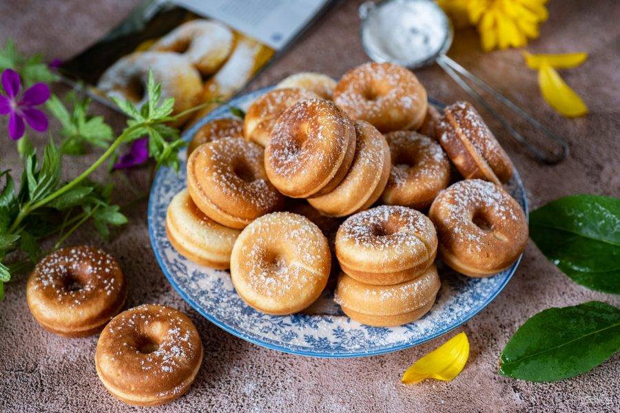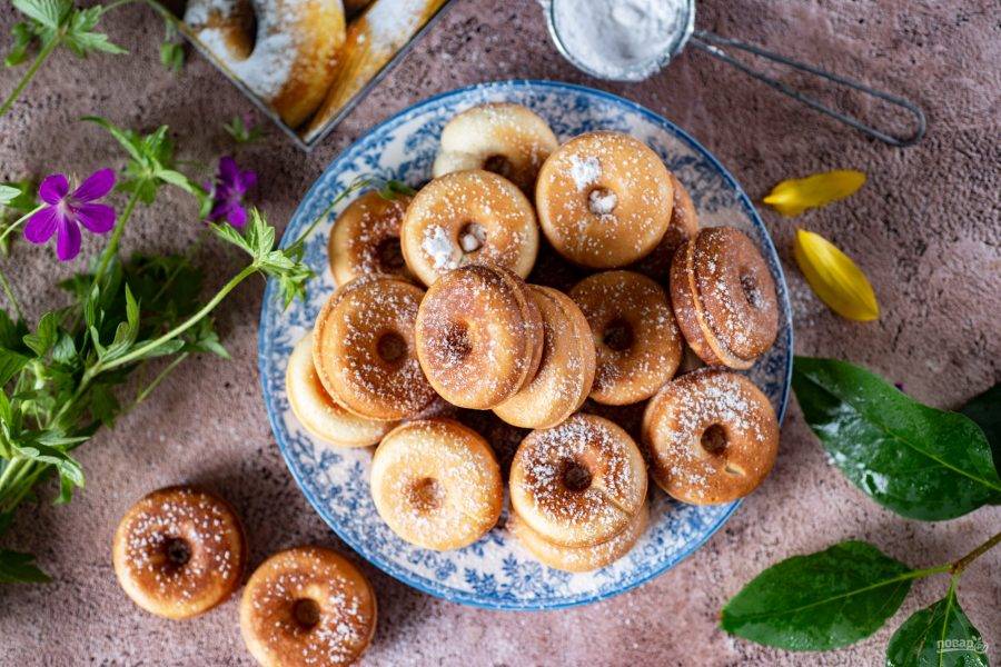 Готовые пончики немного охладите, присыпьте сахарной пудрой и подавайте к столу.