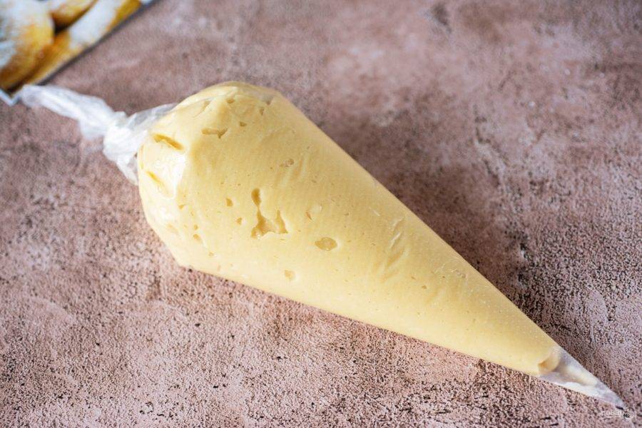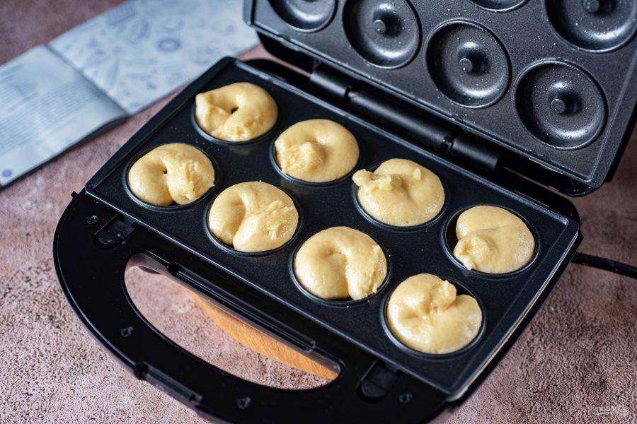 Установите на мультипекаре панели для приготовления пончиков, разогрейте мультипекарь, смажьте тонким слоем растительного масла все рабочие поверхности (достаточно будет одного раза), отсадите тесто из кондитерского мешка, заполняя половинки формочек.