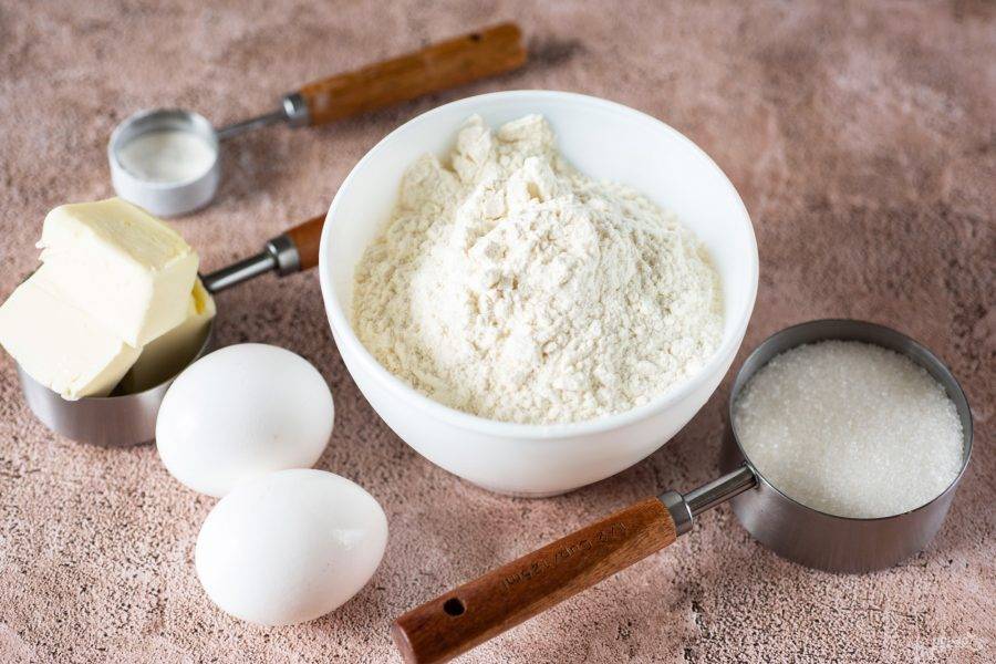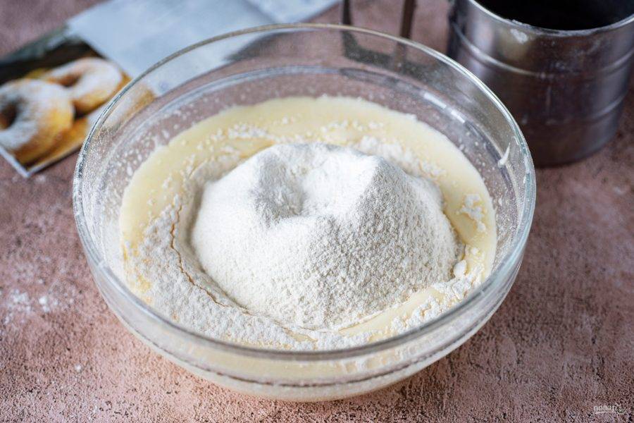 К этой смеси просейте муку и добавьте разрыхлитель.