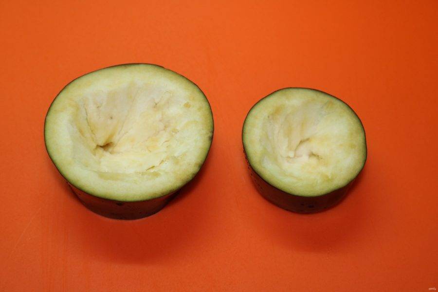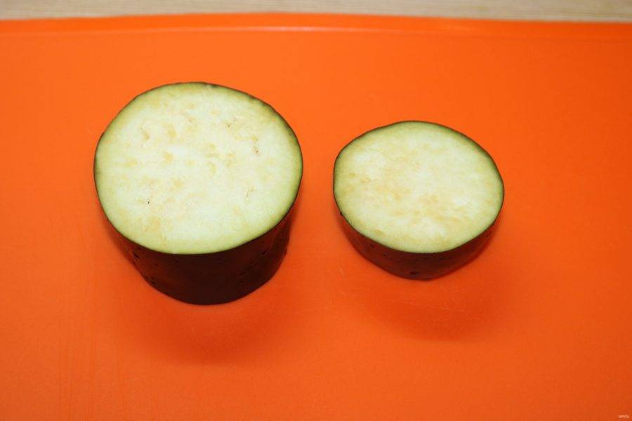 Отрежьте кусочки баклажанов по 3-4 сантиметра толщиной для изготовления пенёчков.