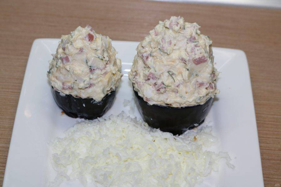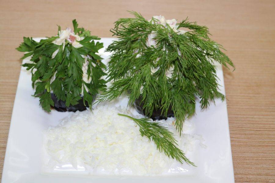Из полученной массы сформируйте конусы на кусочках баклажана.