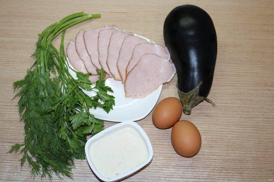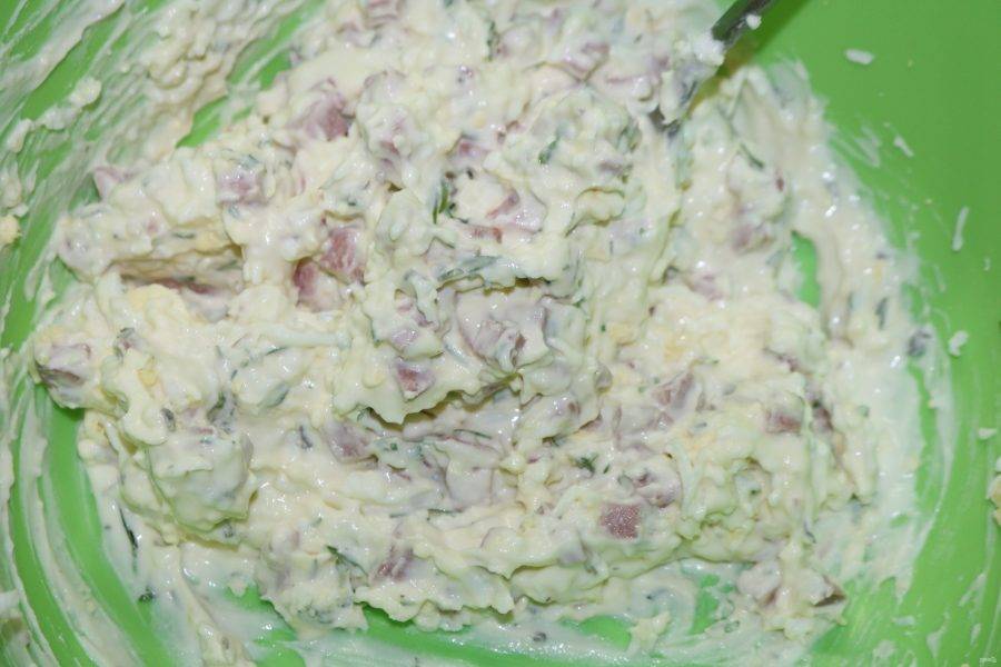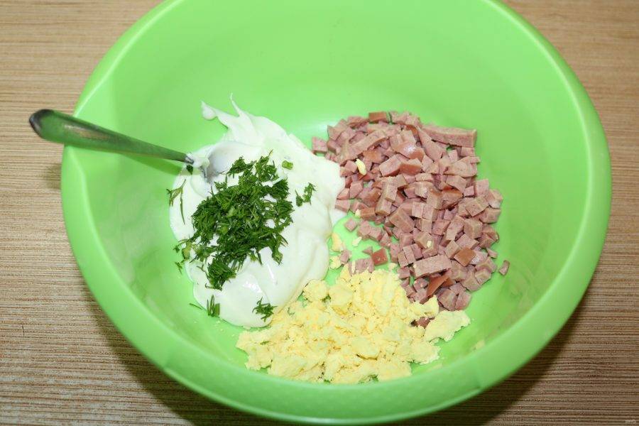Мелко нарежьте ветчину. Добавьте сыр, желтки яиц, мелко нарезанный укроп.