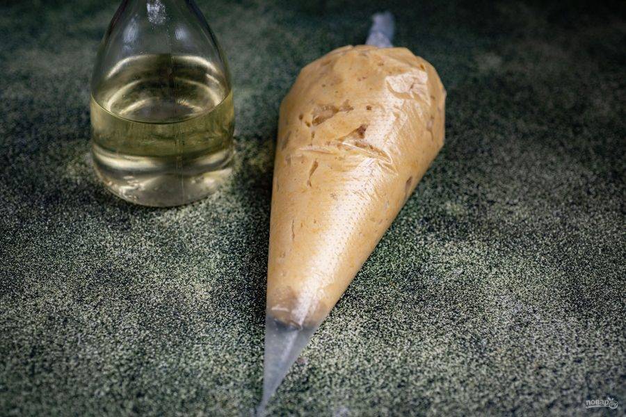 Затем этим тестом заполните кондитерский мешок — это очень удобно. Также можете использовать ложку для мороженого, чтобы порционно брать тесто. На ваш выбор.