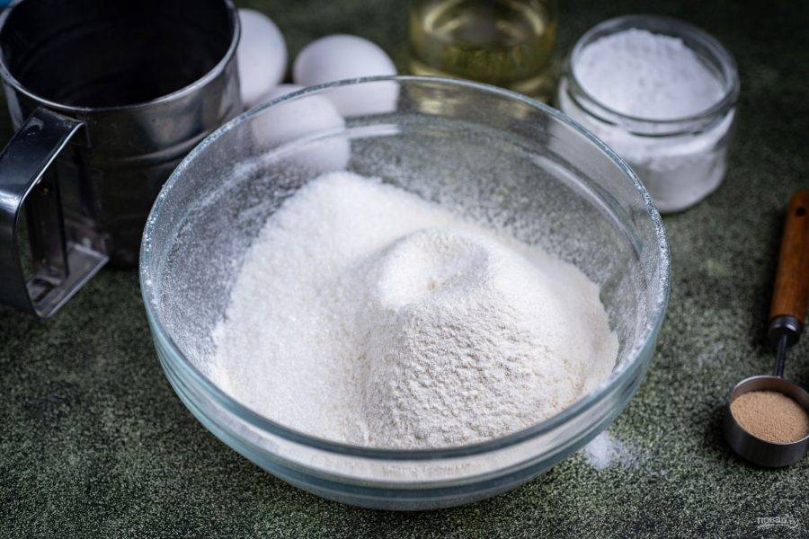 В мучную сухую смесь залейте жидкую яичную смесь.