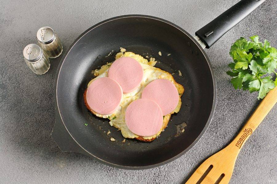 Затем с помощью лопатки аккуратно переверните хлеб, чтобы он оказался на сковороде, а яйцо сверху. Можно посыпать яйцо опять тертым сыром, а затем выложите любую начинку. У меня вареная колбаса, но это может быть бекон, ветчина, сосиски, овощи и т.д.