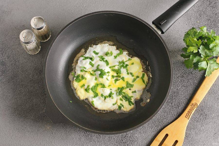В сковороде растопите кусочек сливочного масла (огонь должен быть небольшой). Разбейте яйцо и сразу же лопаткой нужно аккуратно распределить яйцо по сковороде, так, чтобы желток тоже растёкся. Необходимо довести размер яичной лепешки по площади до размера двух кусочков хлеба, с которым вы будете дальше готовить. Яйцо посолите, поперчите и посыпьте рубленой зеленью.