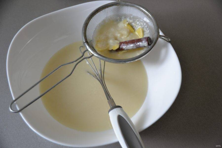 Процедите основу для крема, чтобы удалить возможные комочки, уберите корицу и цедру.
