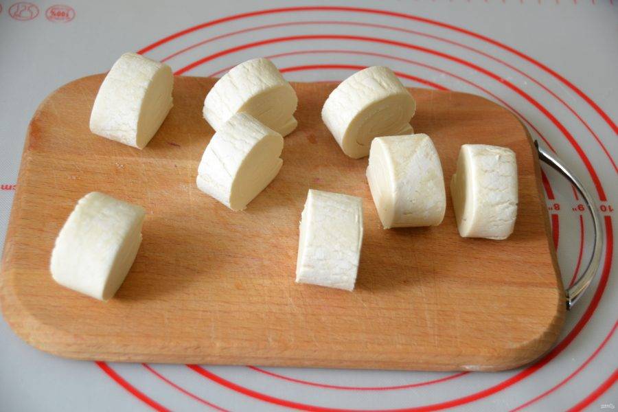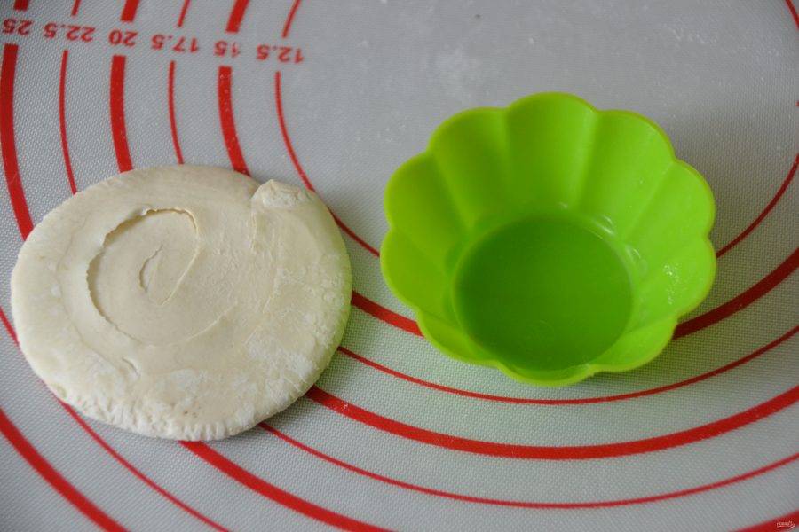 Нарежьте тесто на кружочки толщиной 1,5-2 см., из стандартного листа слоеного теста весом 250 грамм получается 8 заготовок.