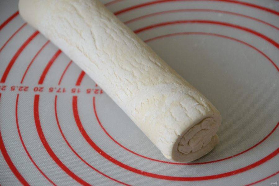 Пока крем охлаждается, займитесь "корзиночками", для этого сверните в плотный рулон пласт слоеного теста.