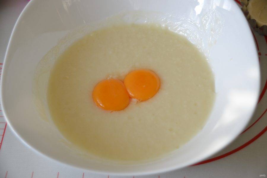 Когда заварная часть крема остынет до комнатной температуры, введите в него 2-4 яичных желтка (в зависимости от размера), размешайте.