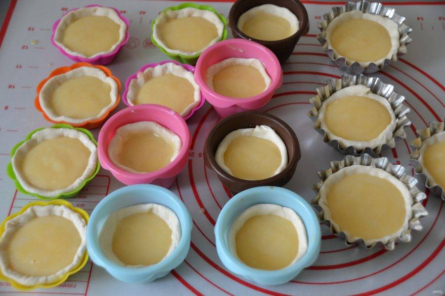 Заполните кремом все "корзиночки" не доходя до краёв примерно 5 мм., при выпечке крем будет подниматься вверх, это надо иметь ввиду. Выпекайте пирожные при температуре 250 градусов 20-25 минут, смотрите за готовностью.