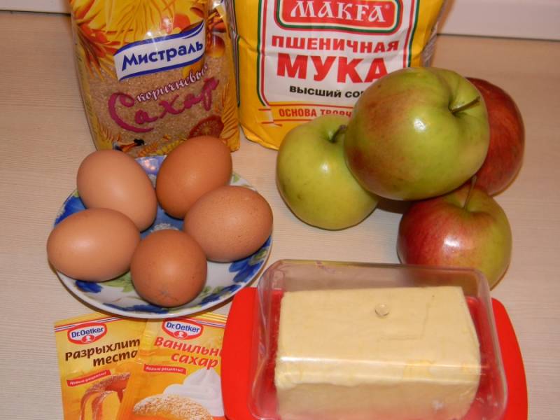 - Что понадобится 7 грамм - 5 яиц - 1 стакан муки - 1 стакан сахара - 1 ч.л. разрыхлителя - 5-6 яблок твёрдых сортов - ванилин - масло для смазывания формы