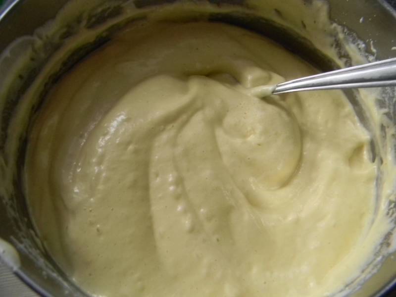 Не переставая взбивать подмешать желтки. Потом муку смешать с разрыхлителем, ванилином и щепоткой соли. Соединить с яичной массой и замесить однородное тесто.