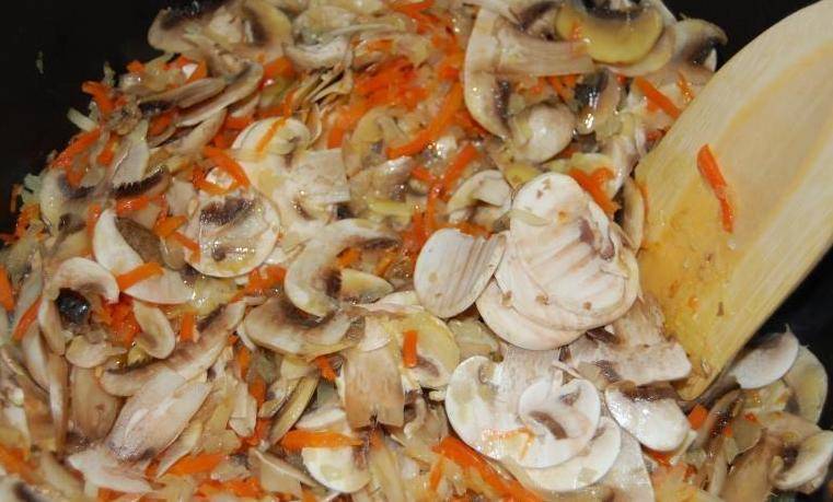 4. Затем добавляем к ним грибы (я беру шампиньоны) и чеснок. Жарим, постоянно помешивая. Не забывает также посолить и приправить по вкусу.