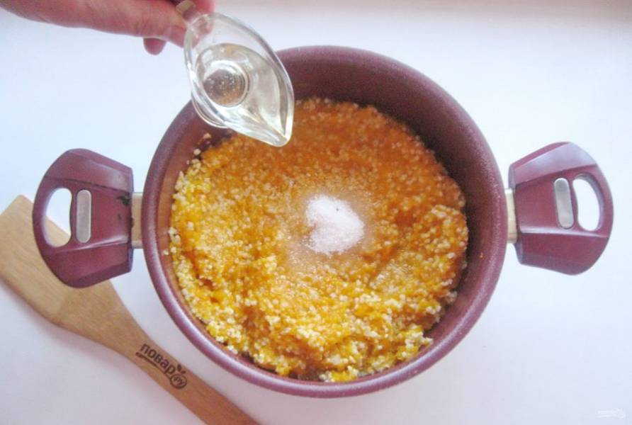 Влейте рафинированное подсолнечное масло и перемешайте кашу.