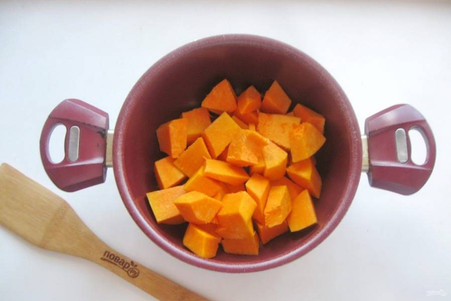 Тыкву очистите, помойте и нарежьте небольшими кусочками. Выложите в кастрюлю с толстым дном или казан.