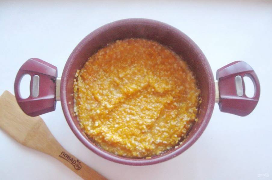 Пшено хорошо промойте и добавьте в кастрюлю с тыквой. Налейте еще 150 мл. воды и варите кашу до готовности пшена.
