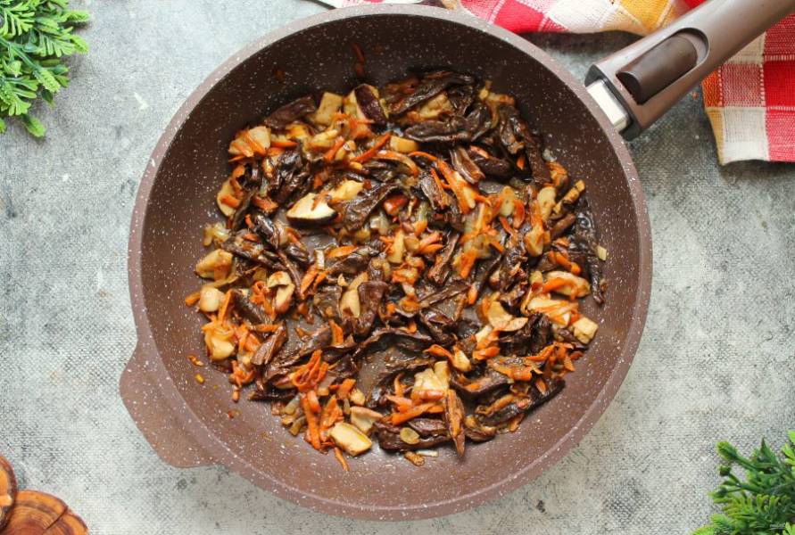 Готовьте все в течение 5-7 минут. Жидкость должна выпариться, а грибы немного обжариться. Вместо замороженных грибов, можно взять свежие лесные, шампиньоны или вешанки.