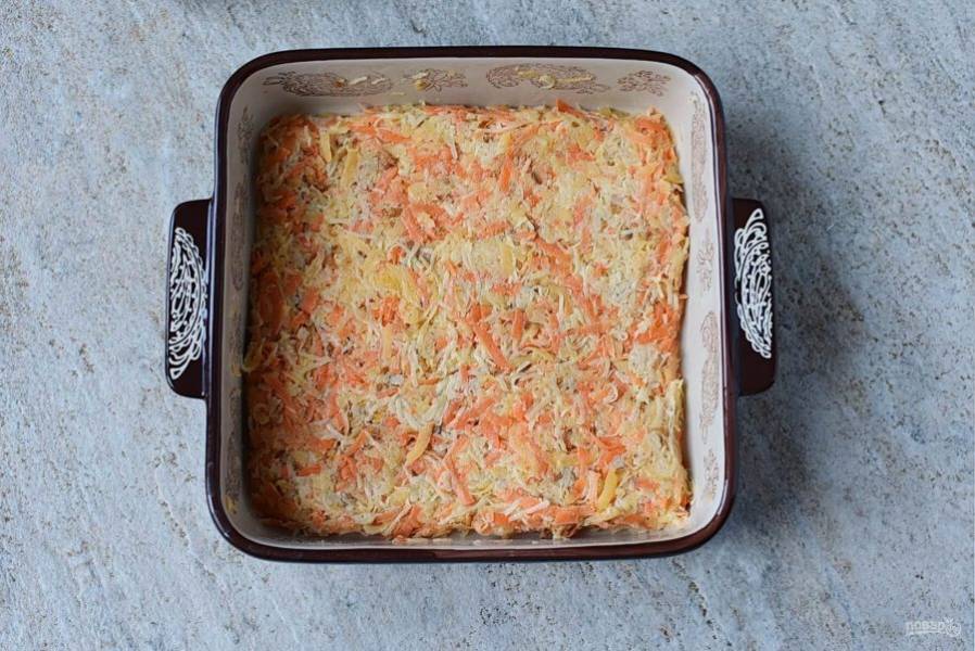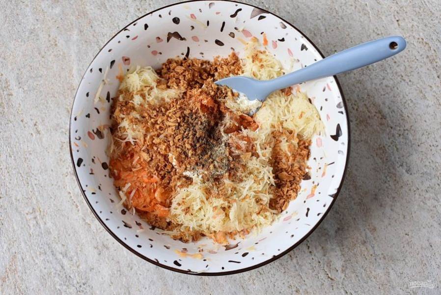 Смешайте тертые овощи с постным майонезом, жареным луком, солью и перцем по вкусу. Слейте с картофельного сока отстоявшуюся жидкость и добавьте осевший крахмал к овощам. Перемешайте хорошенько.
