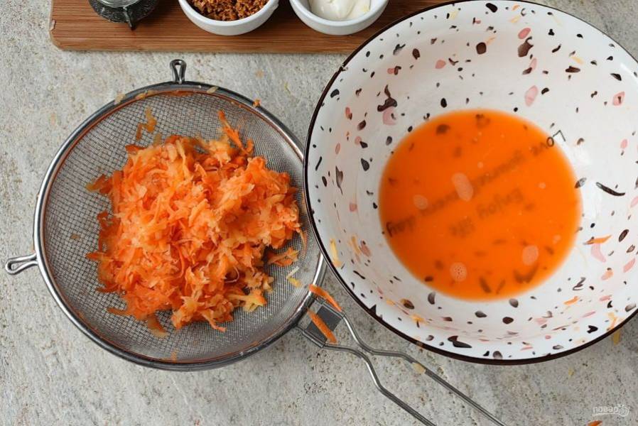 Отожмите натертые морковь и кабачок. Сок можно использовать для добавления в суп или рагу.