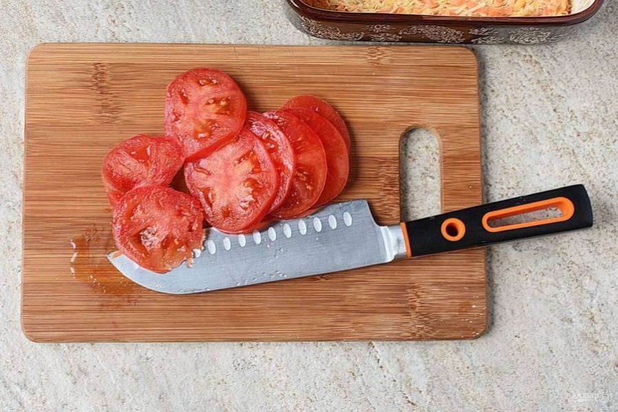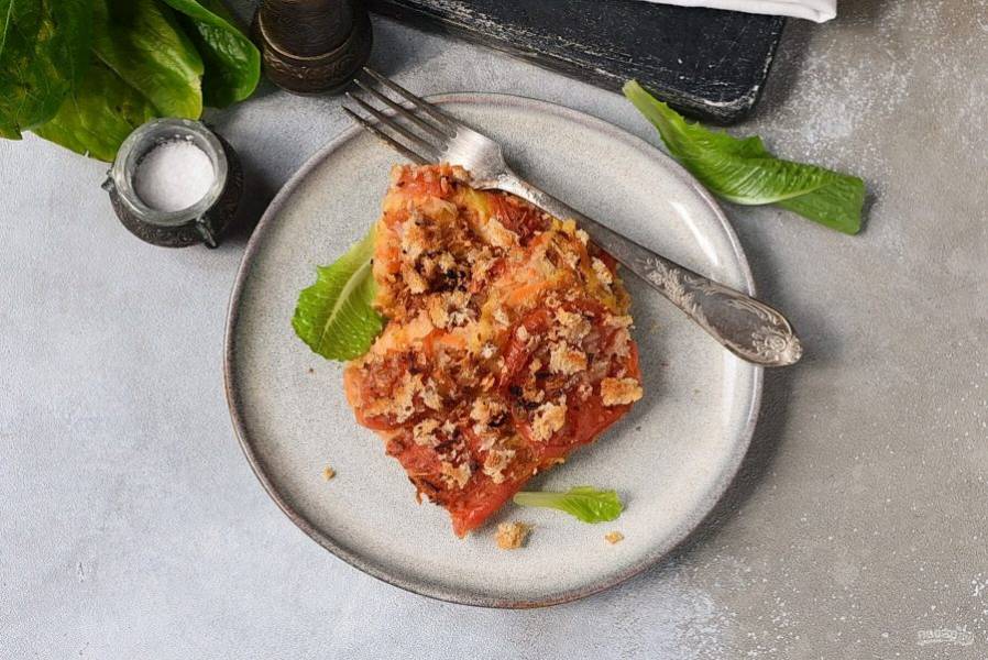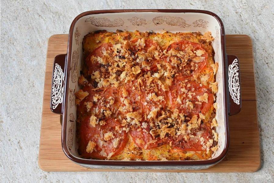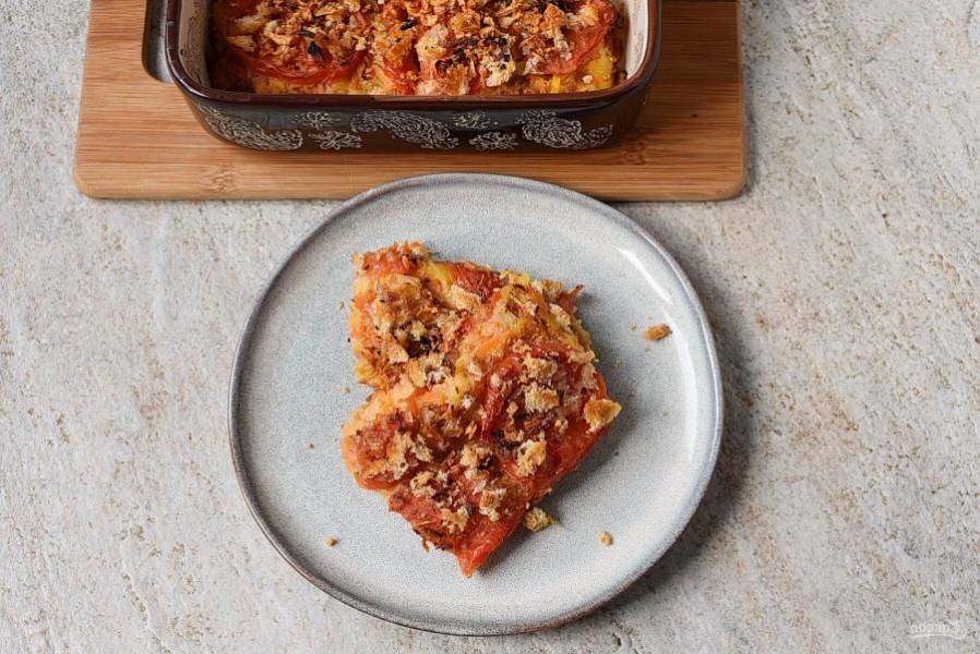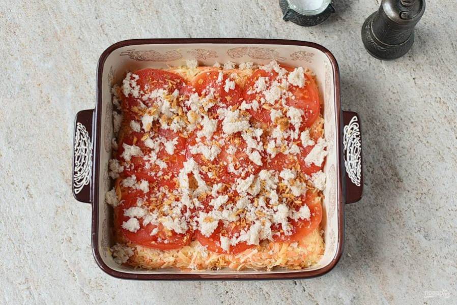 Выложите помидоры поверх овощного слоя. Слегка присолите и поперчите. Раскрошите хлебный мякиш и посыпьте запеканку. Можно дополнительно добавить еще жареного лука.