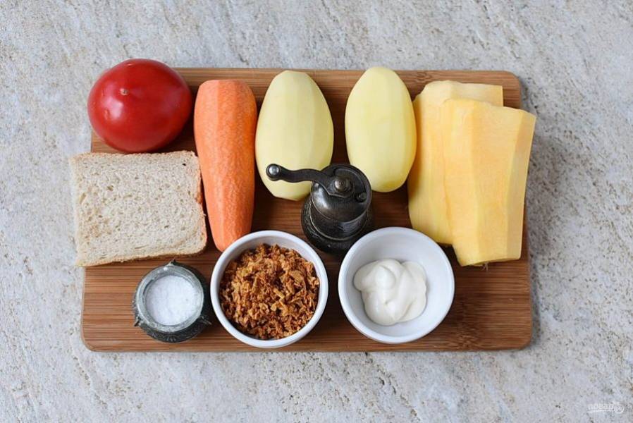 Подготовьте продукты для запеканки. Овощи помойте и очистите. Духовку разогрейте до 180 градусов.
