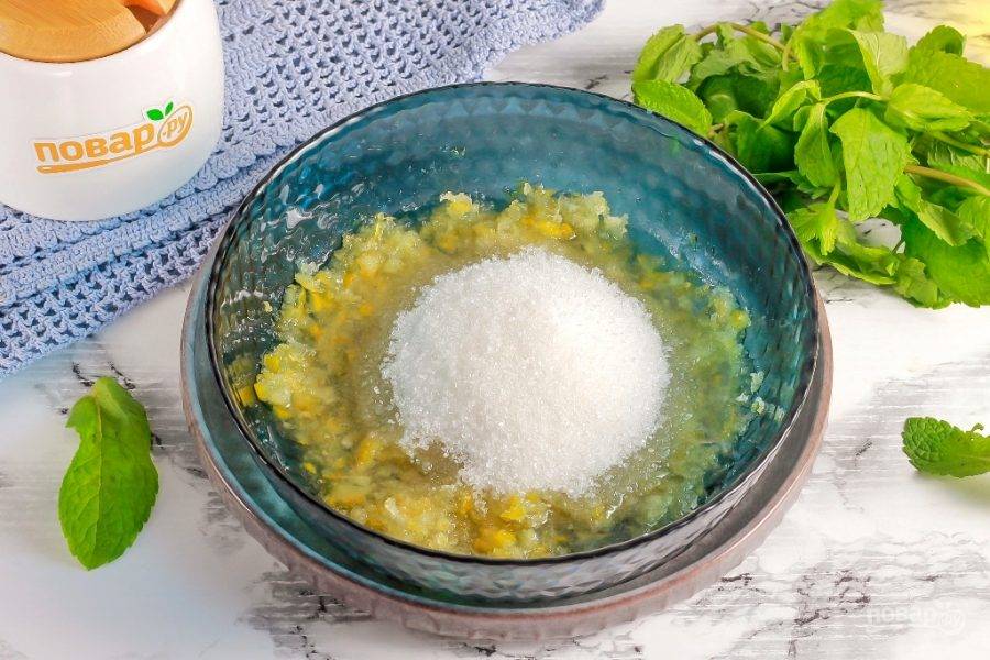 Добавьте в лимонную массу сахарный песок, растительное масло без аромата и тщательно все размешайте.