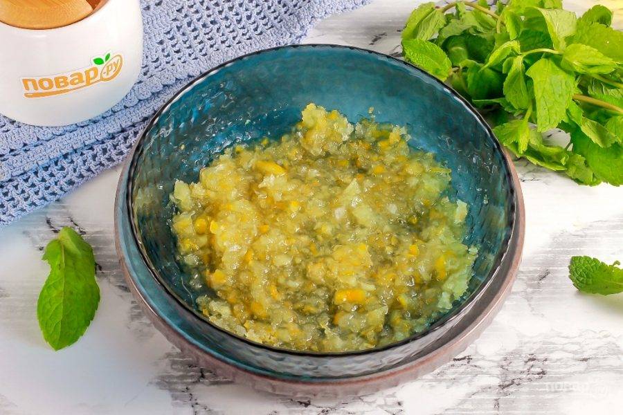 Ошпарьте лимон кипятком и срежьте хвостики. Нарежьте его на четвертинки и удалите косточки. Затем пропустите через мясорубку, установив решетку с мелкими или крупными отверстиями, по желанию.