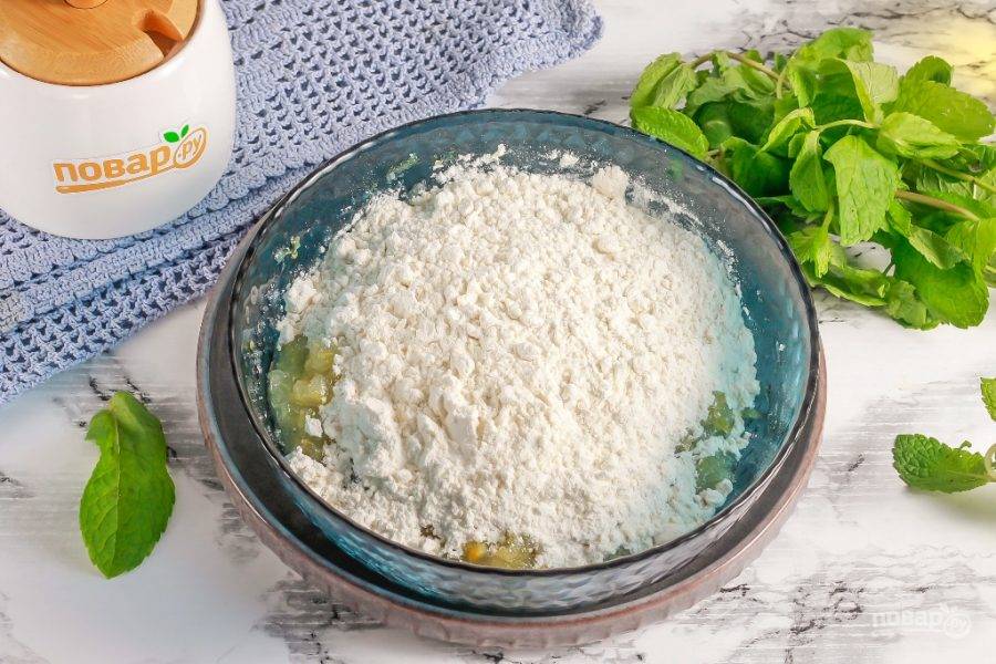 Всыпьте пшеничную муку высшего сорта и разрыхлитель. Вместо разрыхлителя можно добавить 1/4 ч.л. соды, гашеной уксусом.