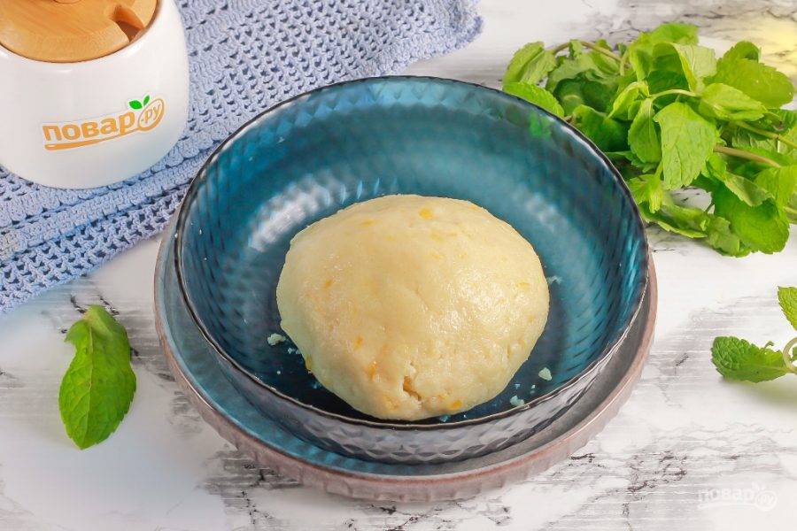 Замесите плотное песочное тесто. Сначала вам будет казаться, чтобы муки много, но потом она вся вмешается в массу и вы сможете собрать тесто в колобок. Муки может уйти чуть больше или чуть меньше, в зависимости от величины лимона. Накройте тесто пищевой пленкой или поместите в пакет, а затем — в холодильник на 15 минут, чтобы оно охладилось.