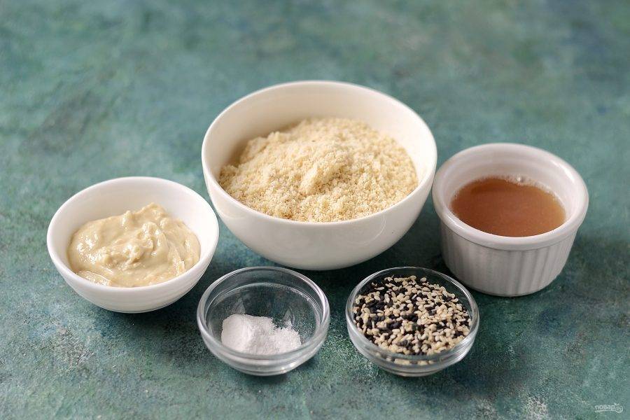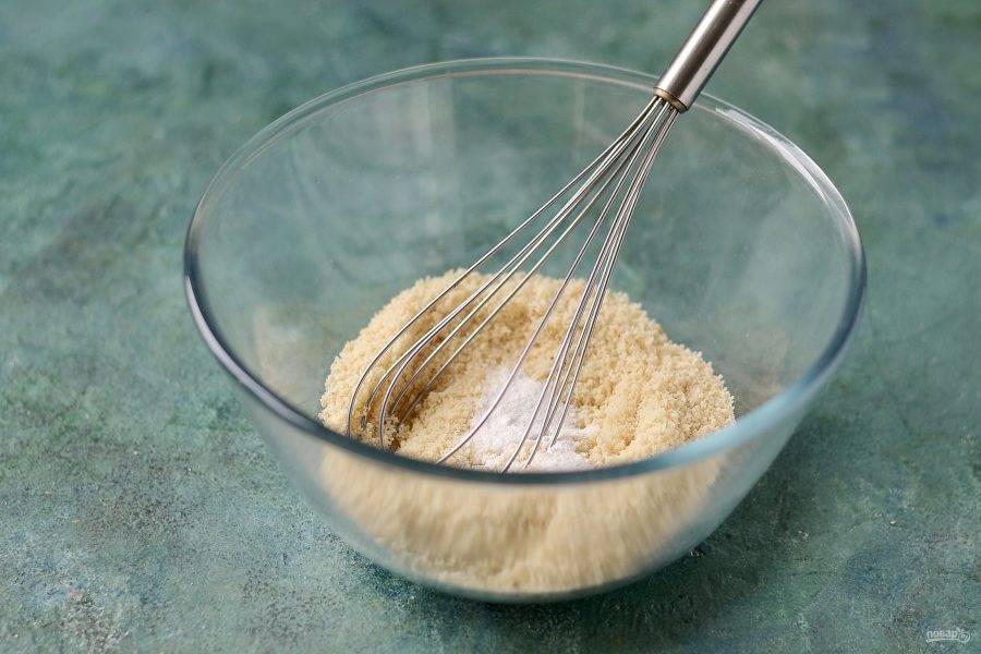 Соедините обе смеси. Тесто должно получиться густым, как песочное. При необходимости можно подсыпать еще миндальной муки.