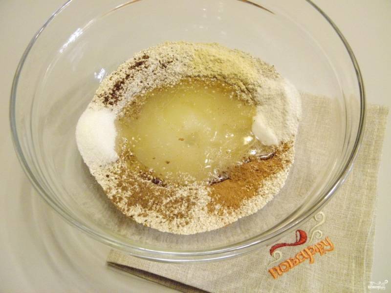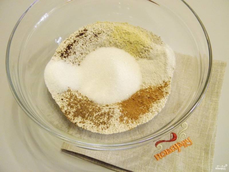 4. Пересыпьте молотые хлопья в глубокую удобную посудину, добавьте сахар, разрыхлитель и набор специй. Количество специй — на ваш вкус, я кладу примерно такое количество, как в описании, только все ложечки без горки!