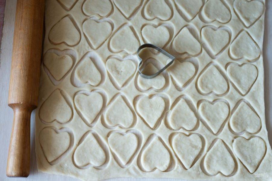 Тесто раскатайте в тонкий пласт с помощью скалки и кондитерской вырубкой любой формы выдавите заготовки будущего печенья.