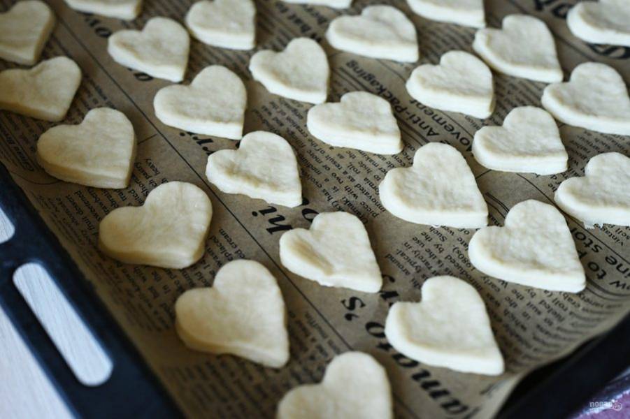 Все заготовки печенья перенесите на противень, застеленный пергаментом для выпекания. Отправьте печенье выпекаться в заранее разогретую до 180 градусов духовку на 10-15 минут.