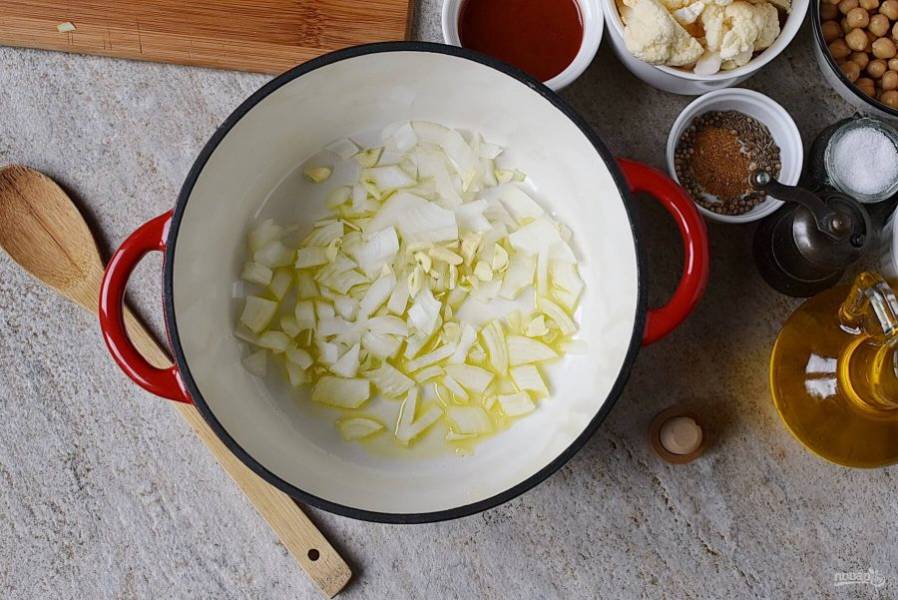 В просторной жаровне разогрейте растительное масло. Добавьте лук и чеснок, жарьте, помешивая, до легкого румянца.