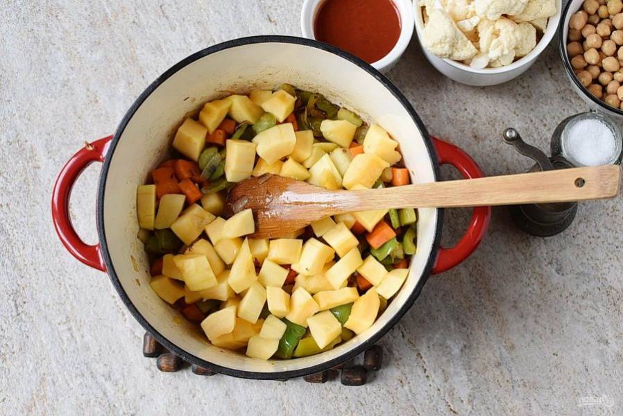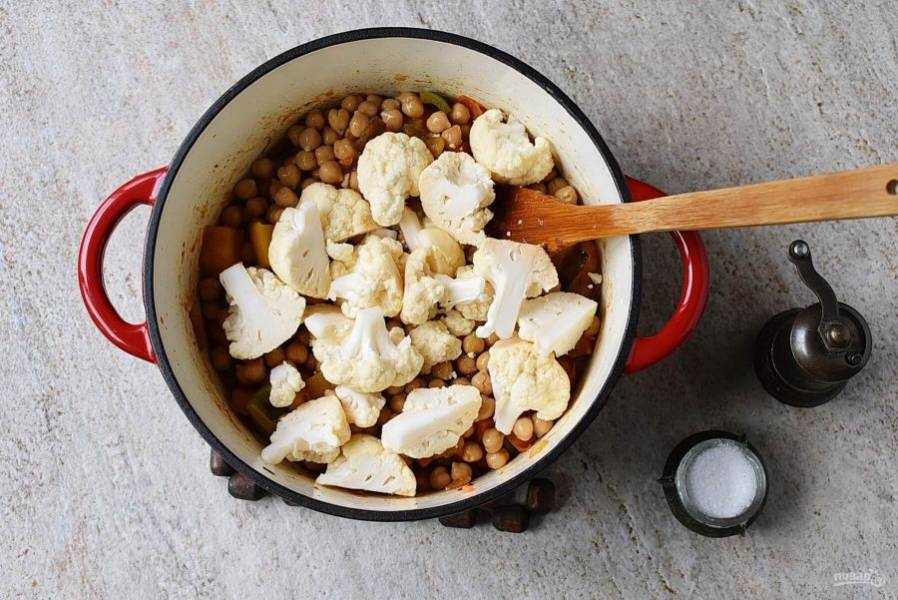 Добавьте обсушенный консервированный нут и нарезанную цветную капусту.