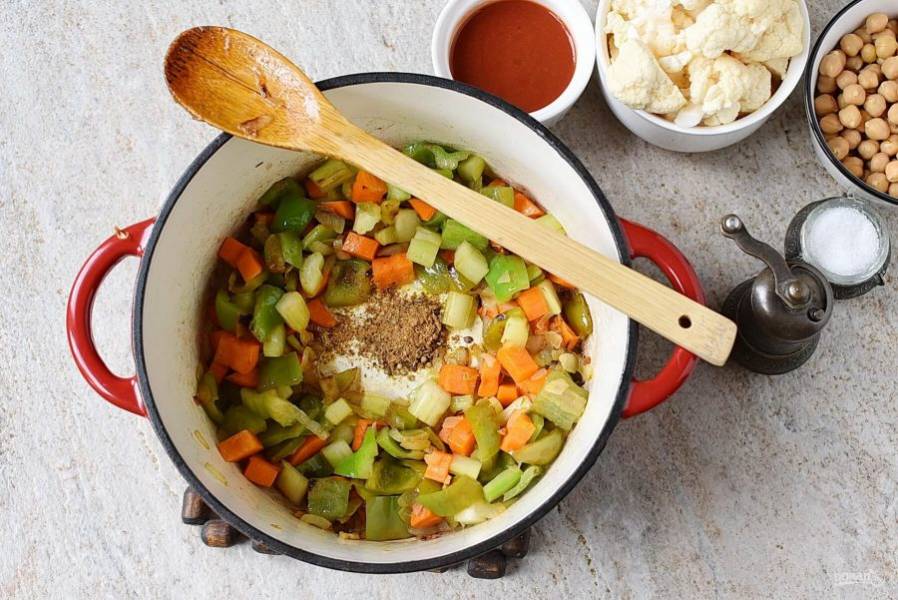 Раздвиньте овощи и высыпьте в середину смесь крупно растолченных пряностей. Прогрейте полминуты, затем перемешайте пряности с овощами.