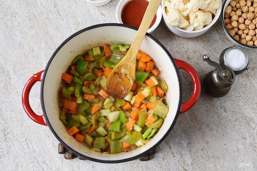 Добавьте сладкий перец и сельдерей, подрумяньте немного.