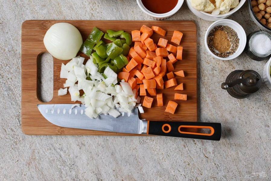 Нарежьте овощи кубиками среднего размера.