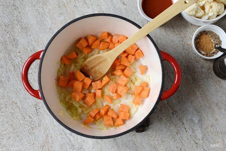 Добавьте кубики моркови и обжарьте пару минут.