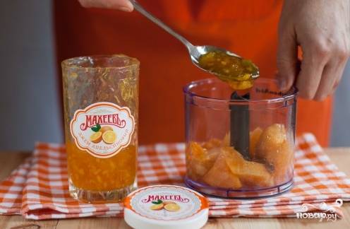 Мякоть хурмы поместите в чашу блендера, добавьте апельсиновый джем, измельчите-перемешайте все до однородной массы.
