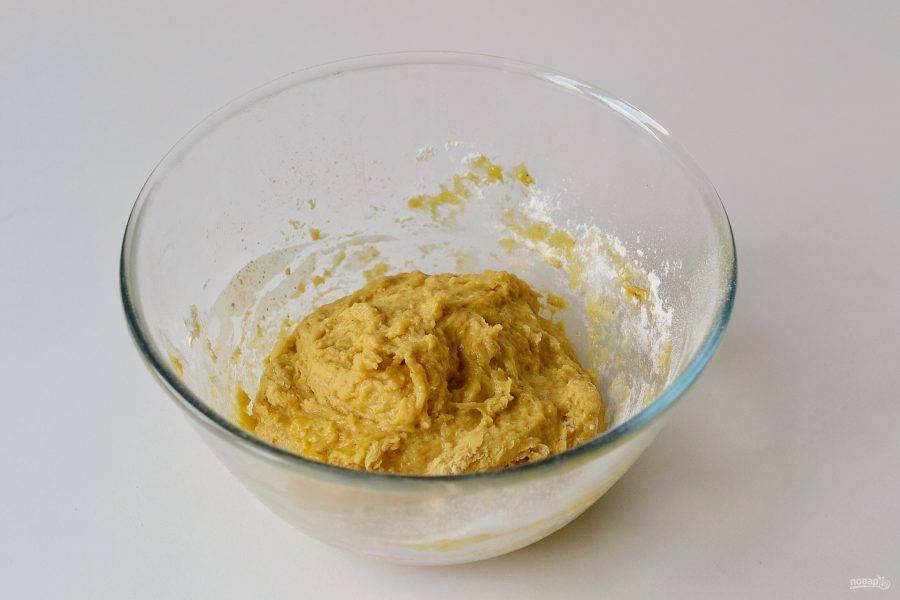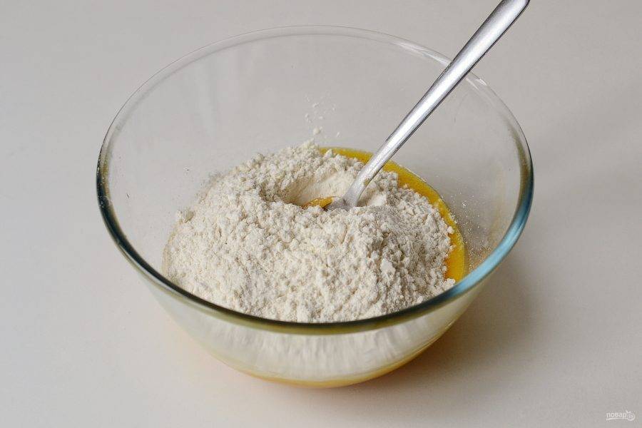 Добавьте гашеную укусом соду, перемешайте. Затем добавьте все специи и муку.