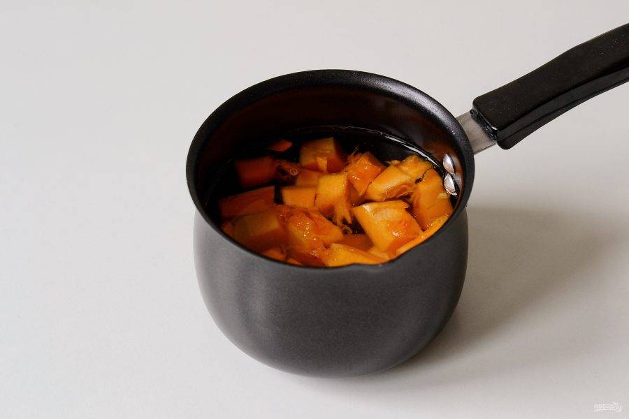 Тыкву нарежьте кубиками, переложите в ковшик, добавьте воду и варите до мягкости.